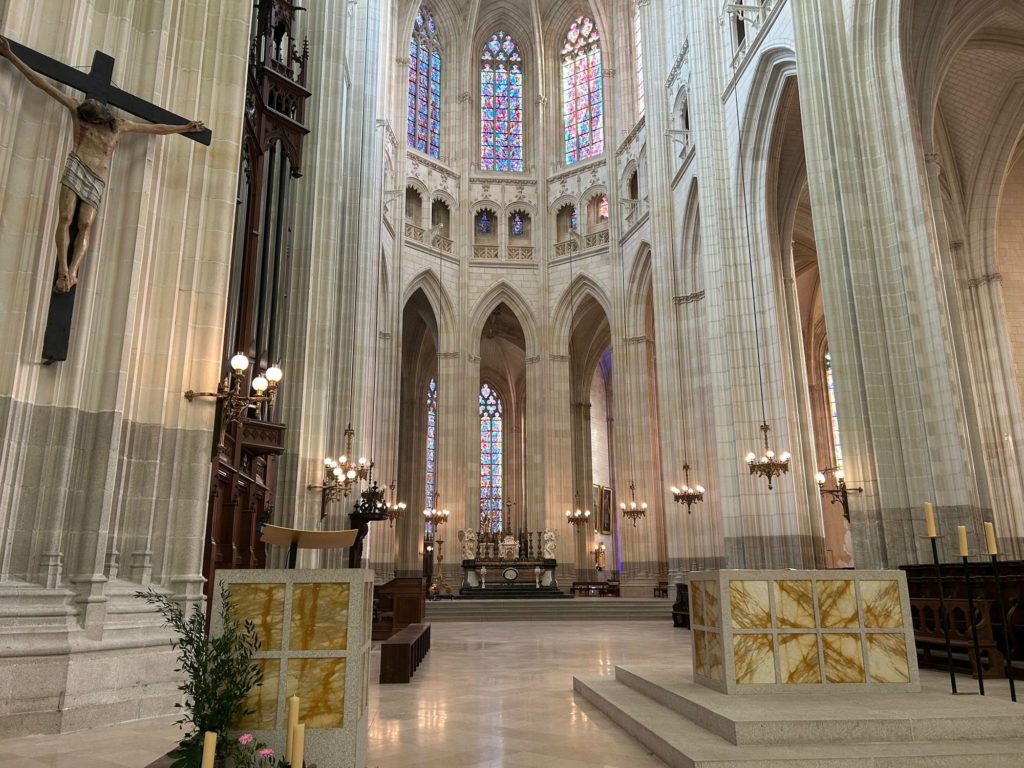On a appris que la cathédrale faisait la longueur d’un terrain de foot. Elle est en construite en granit (les fondations) et en tuffeau (en haut) et le toit est en ardoises.